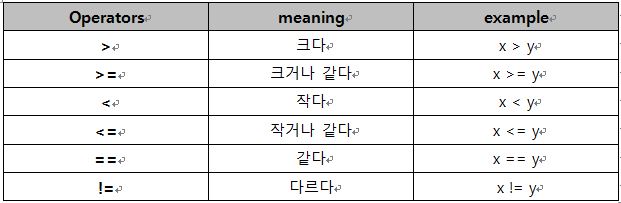 위의 표에 다 설며오디어 있으므로, 딱히 설명드릴 게 없습니다. x값이 y값과 비교했을 시에 (meaning)하면, true 값을 반환, 그렇지 않으면 false 값을 반환합니다.